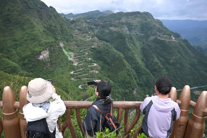 游客在贵州省晴隆县二十四道拐观景台拍照(2025年10月6日摄,无人机照片)。